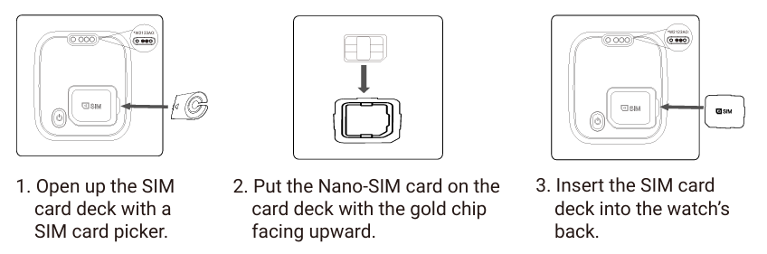 - Öffnen Sie das SIM-Kartendeck auf der Rückseite der Uhr mithilfe des mitgelieferten SIM-Kartenwählers.