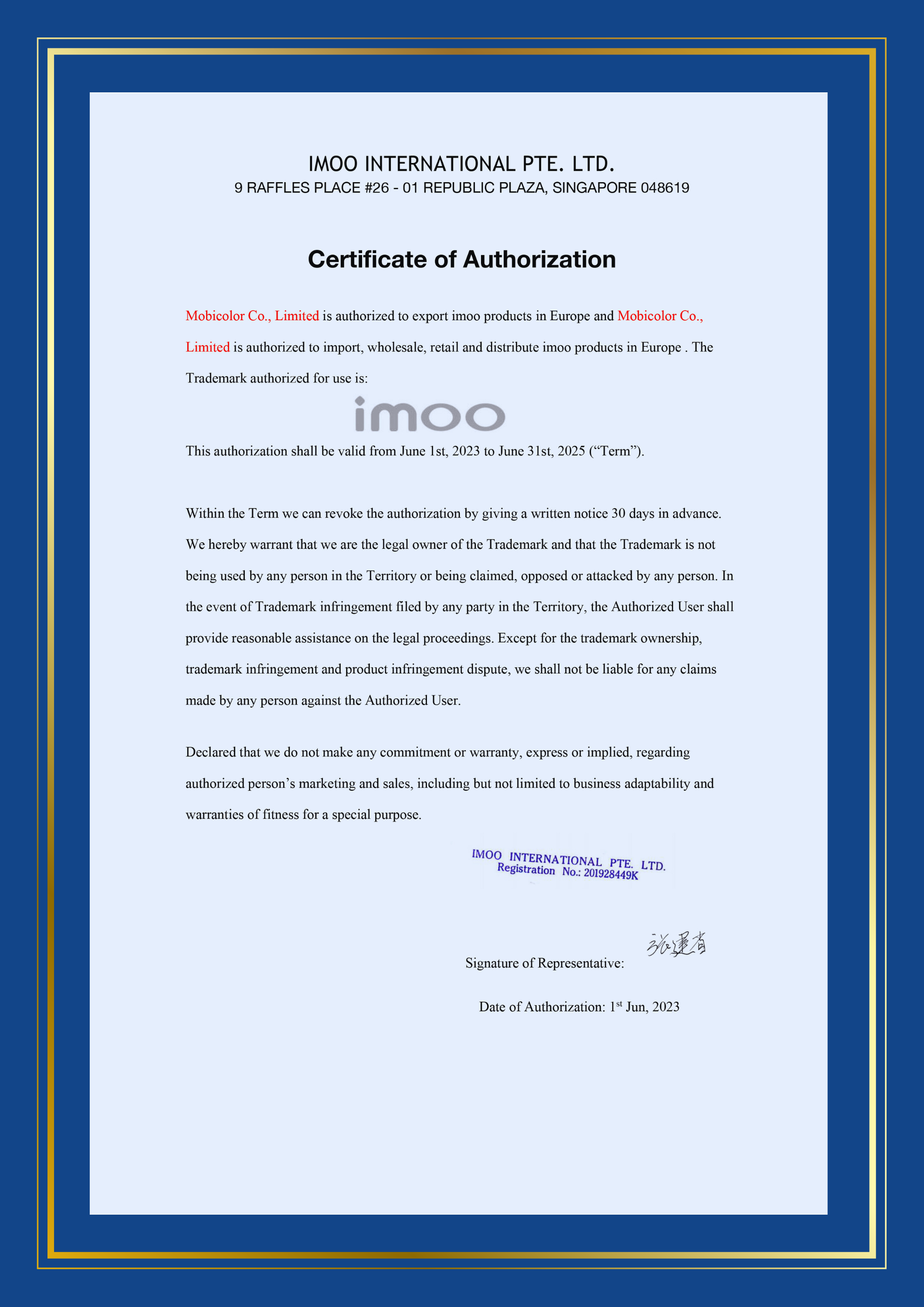 Bei imoo.me (betrieben von Mobicolor Co., Limited) sind wir stolz darauf, Ihre vertrauenswürdige Quelle für imoo-Produkte zu sein. Wir möchten Ihnen versichern, dass wir ein autorisierter Wiederverkäufer von imoo sind, was bedeutet, dass Sie vertrauensvoll einkaufen können, da Sie wissen, dass Sie Originalprodukte mit Herstellersupport erhalten.